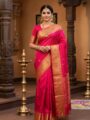 Turn heads with this bright pink pure handloom double-warp saree featuring luxurious gold zari Kanchi borders and subtle woven motifs. Perfect for festivals, receptions, and cultural ceremonies.