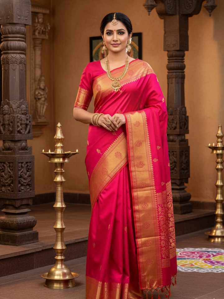 Pure Handloom Double Warp Kanchi Border Saree – Bright Pink