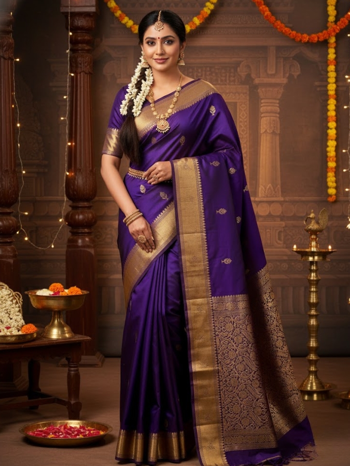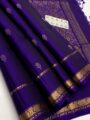 Experience timeless elegance with this royal purple pure handloom double-warp saree featuring an intricate Kanchi-style zari border, floral motifs, and a soft silk finish. Perfect for weddings, festivals, and special occasions.