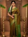 Classic brown silk body beautifully matched with a vibrant green border and tiny woven buttas. A perfect choice for elegant traditional wear.