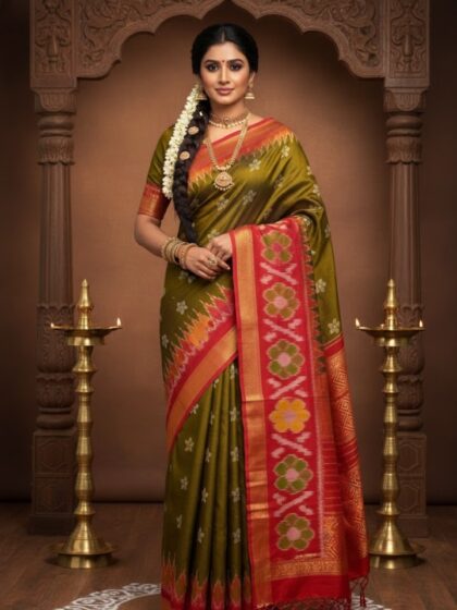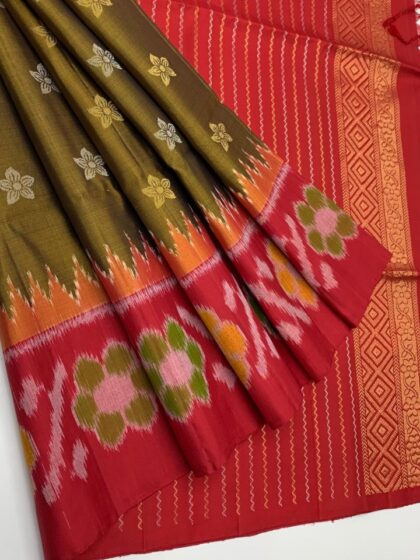 Handloom Olive Green & Red Pochampally Ikat Silk Saree with Tissue Border