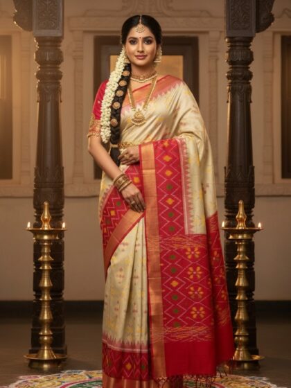 Cream & Red Pure Handloom Pochampally Ikat Silk Saree with Tissue Border
