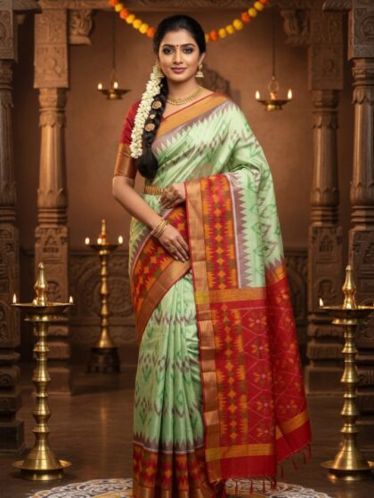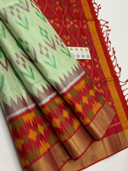 Light Green Pochampally Ikat Silk Saree with Red Pallu & Tissue Border
